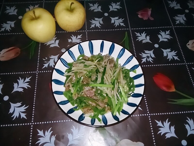 2:鲜肉切丝,用盐、料酒腌制十分钟,加水淀粉抓匀。