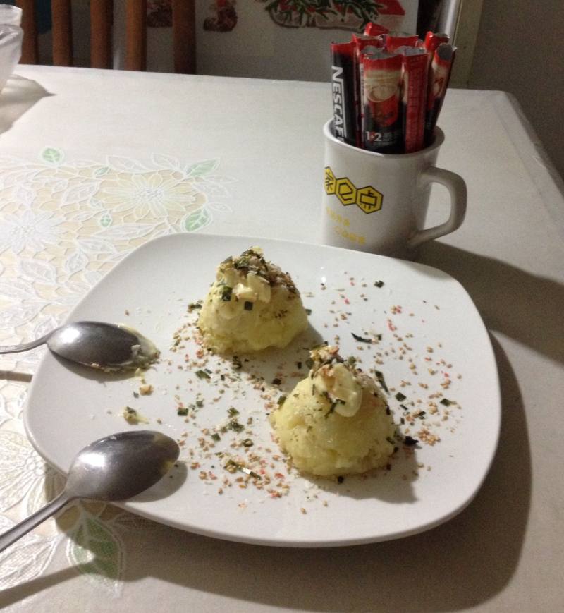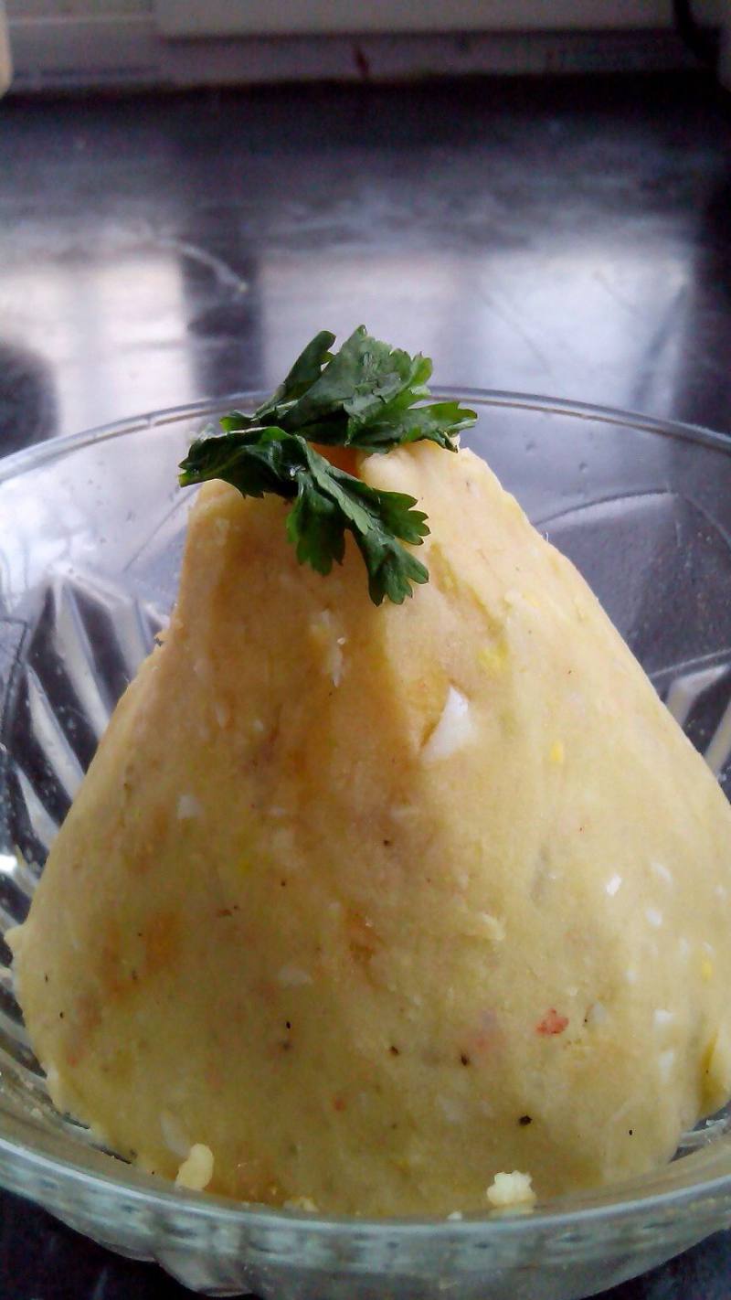 1:将土豆切片蒸熟用刀背压成泥(我这是蒸红薯的时候顺便一起整个蒸的);