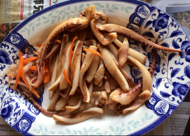 1:将鱿鱼的墨汁冲洗干净,水中放入3匙白醋、一勺料酒、2匙盐,将鱿鱼浸泡20分钟。