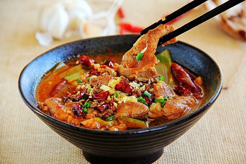 8:另起锅烧热,下花椒和干辣椒炒香,倒入煮好的肉片上,撒上葱花即可