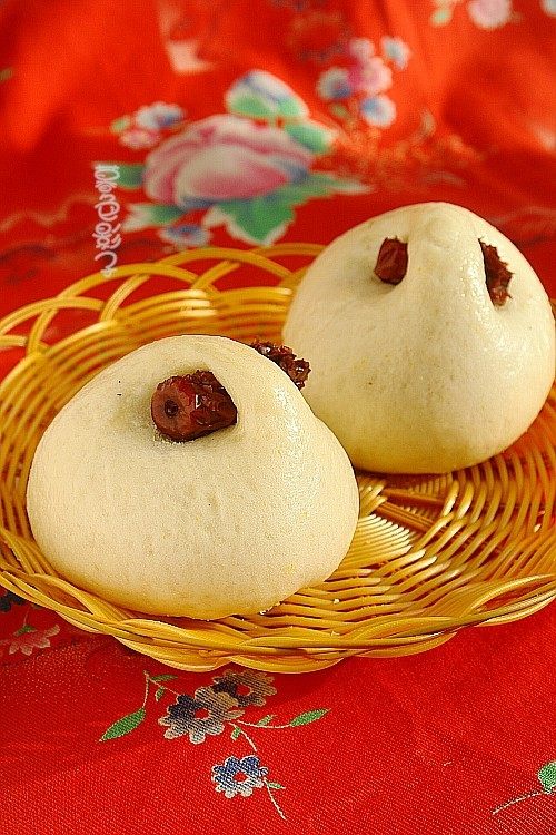 15:水开后上锅蒸一小时,如果没有提前烧水,在等水开的时候一定要把馍馍盖起来哦,免花花干掉了,关火后点上用红曲制成的红点点。