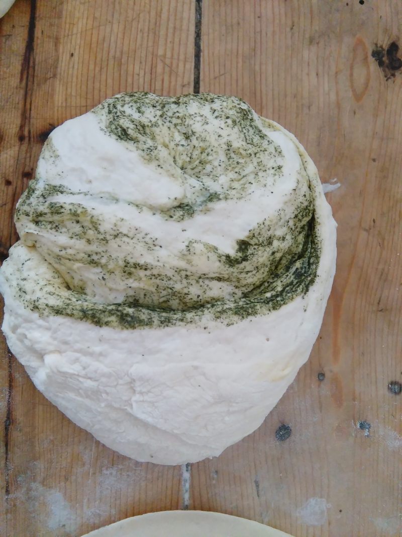 1:发面,揉面,至不沾手,要稍软。之后,取三分之二擀开。