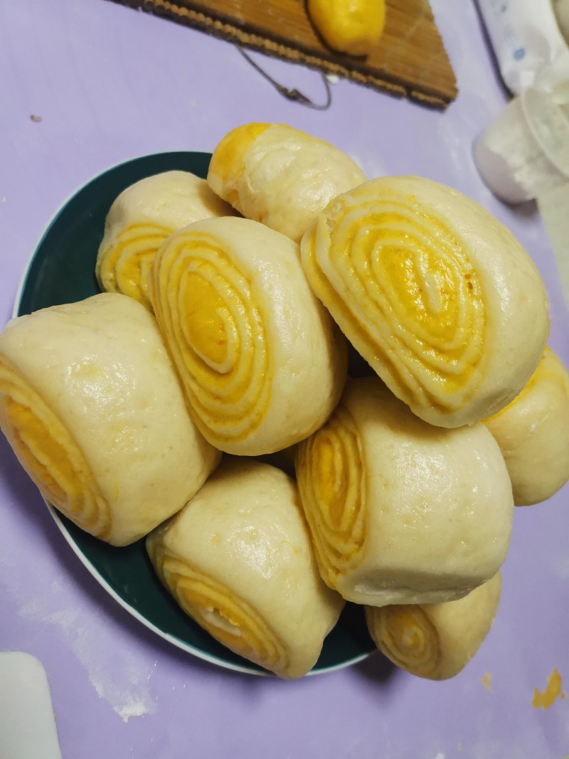 1:因为手误,过程照片被删除了!南瓜先去皮,切片上锅蒸15分钟,蒸软,也可以用破壁机直接打成南瓜糊,然后放入白糖,不喜欢太甜可以不放,等南瓜泥放凉后加入面粉,面粉和南瓜泥比例1:1.5,加入酵母粉,300克面粉3克酵母粉,也可以加入一点牛奶增加奶香味,如果觉得面团太软可以根据情况慢慢加面粉,直到能揉成团,(如果做两色馍馍,这时再揉个白面粉的面团同时醒发)揉成面团后盖上保鲜膜醒发到2倍大小,就可以取出来揉一会,搓成长条状,(如果是两色馍馍,这时要擀成大面皮,白色面皮和黄色面皮一样大,然后叠一起卷起来就可以了)切成均匀的面剂,稍微整理一下,团团棱角