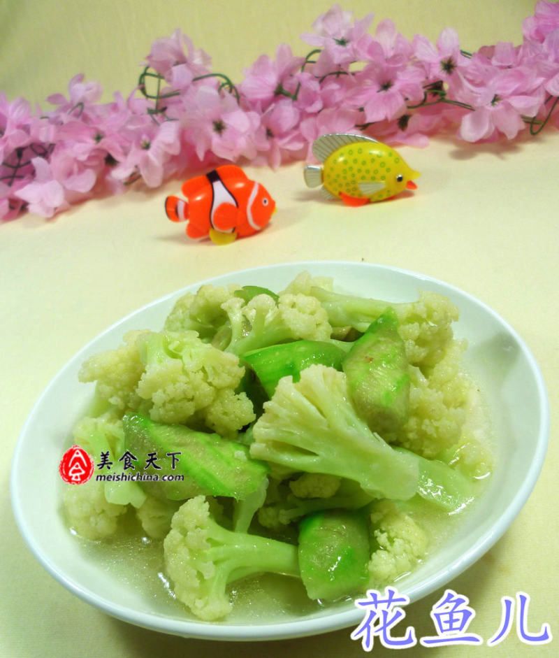 4:烧锅倒油烧热,下入菜花翻炒翻炒。