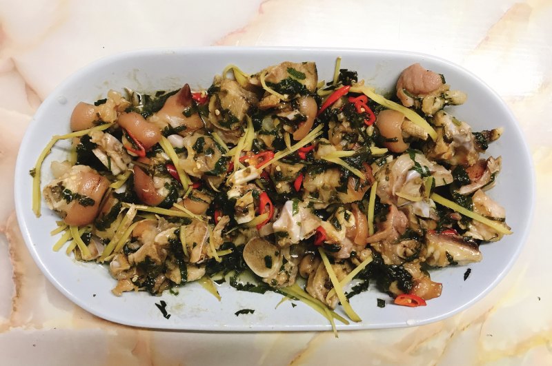 4:起锅后将盘内的姜片、小葱段、紫苏叶夹出;