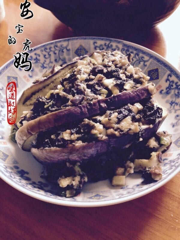 6:将茄子清洗干净切两刀,把上一步骤的混合物塞进切口里,口味重的可以在茄子上再撒些盐,隔水蒸熟即可,大概蒸20分钟左右。