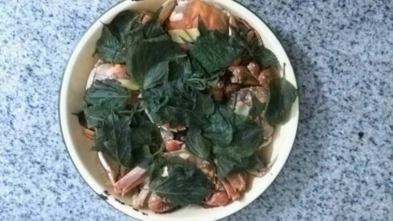 3:锅里放水,投入一半的紫苏,烧开后把大闸蟹烫一下捞出;
