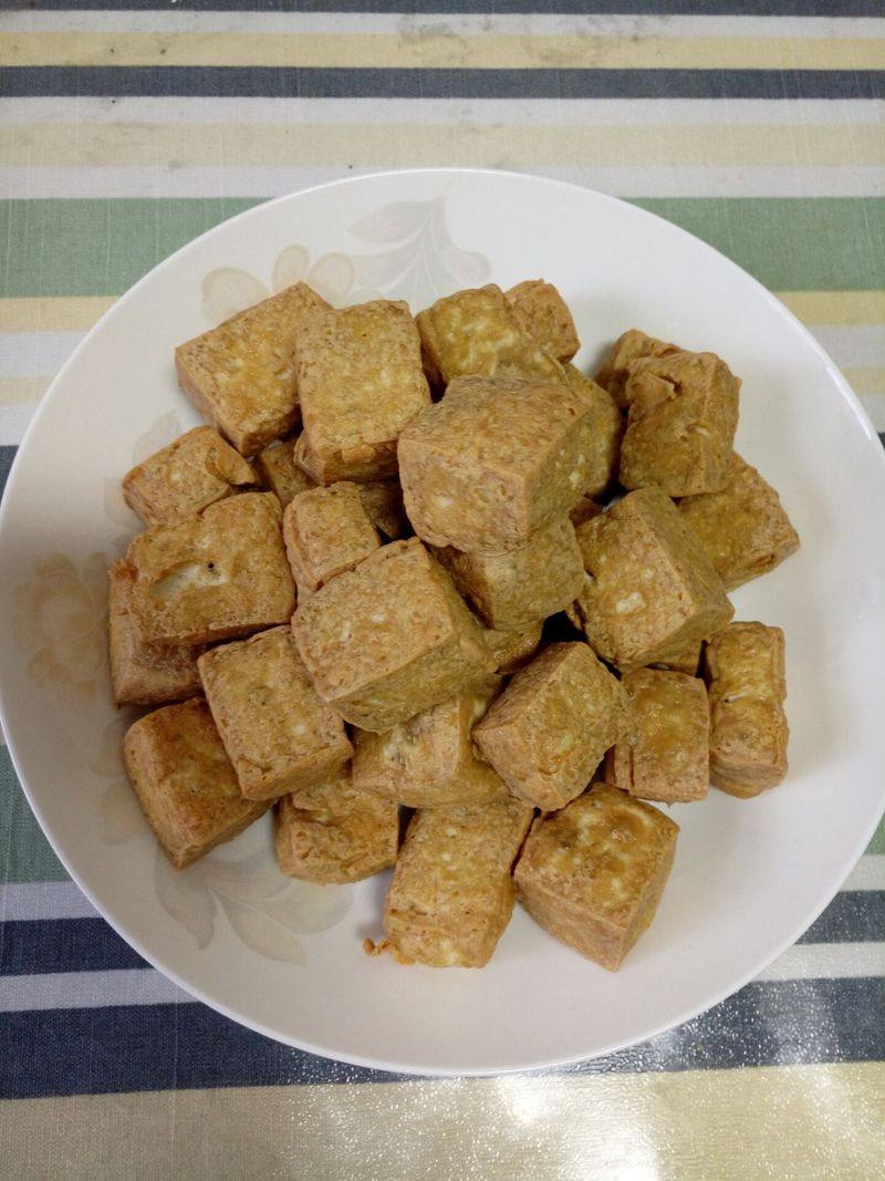 2:炒锅加宽油,烧至七成热,放入豆腐块,炸至四面金黄。