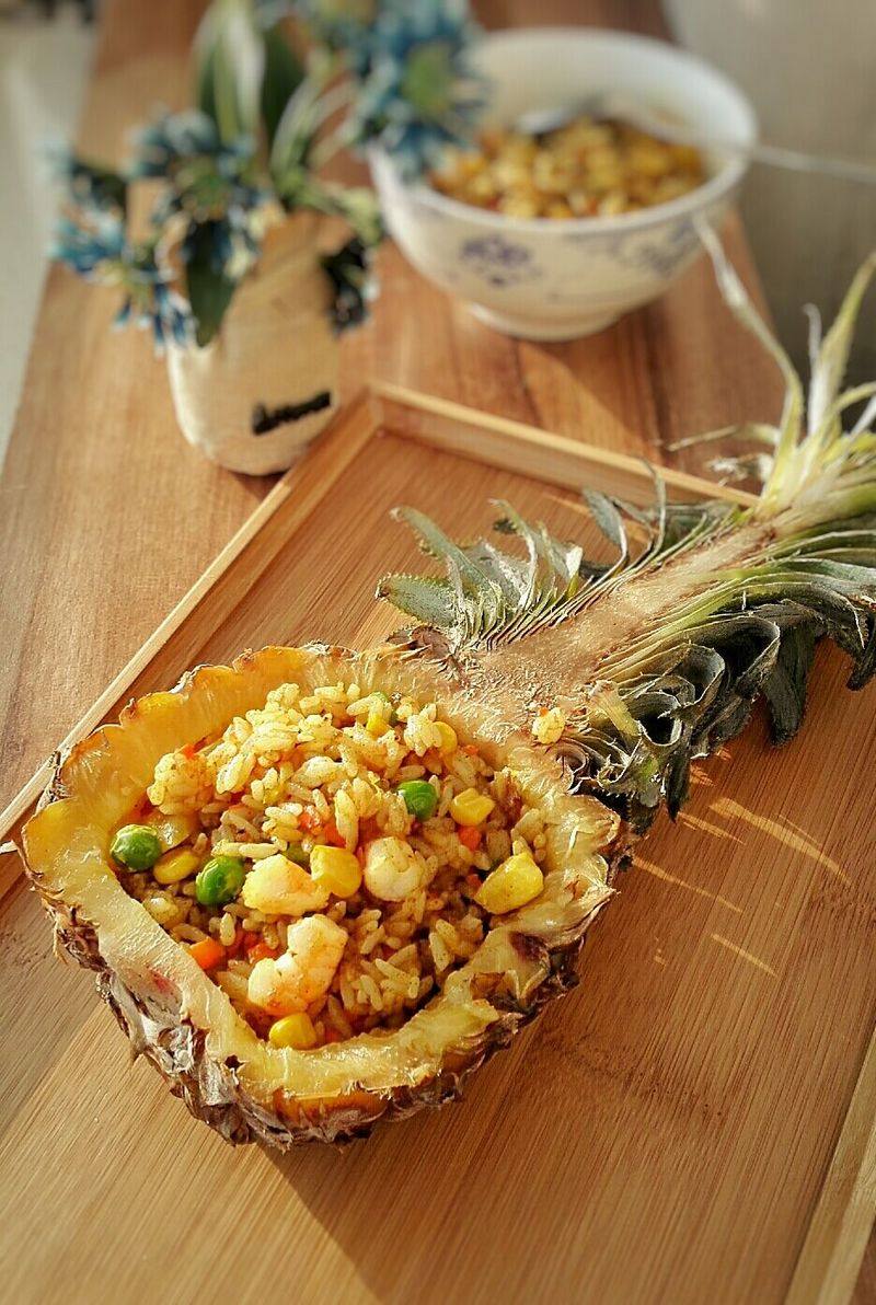 8:米饭盛入菠萝中,摆盘,香喷喷的泰式鲜虾咖喱饭就做好了,盛在菠萝里能闻到菠萝的香,混着咖喱的味道,真是美妙。