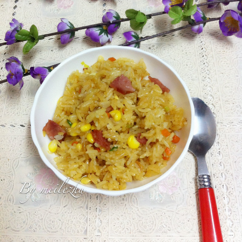 白饭适量;培根肉4片;甜玉米1个;胡萝卜1/2个;蒜头2瓣;香葱2棵;