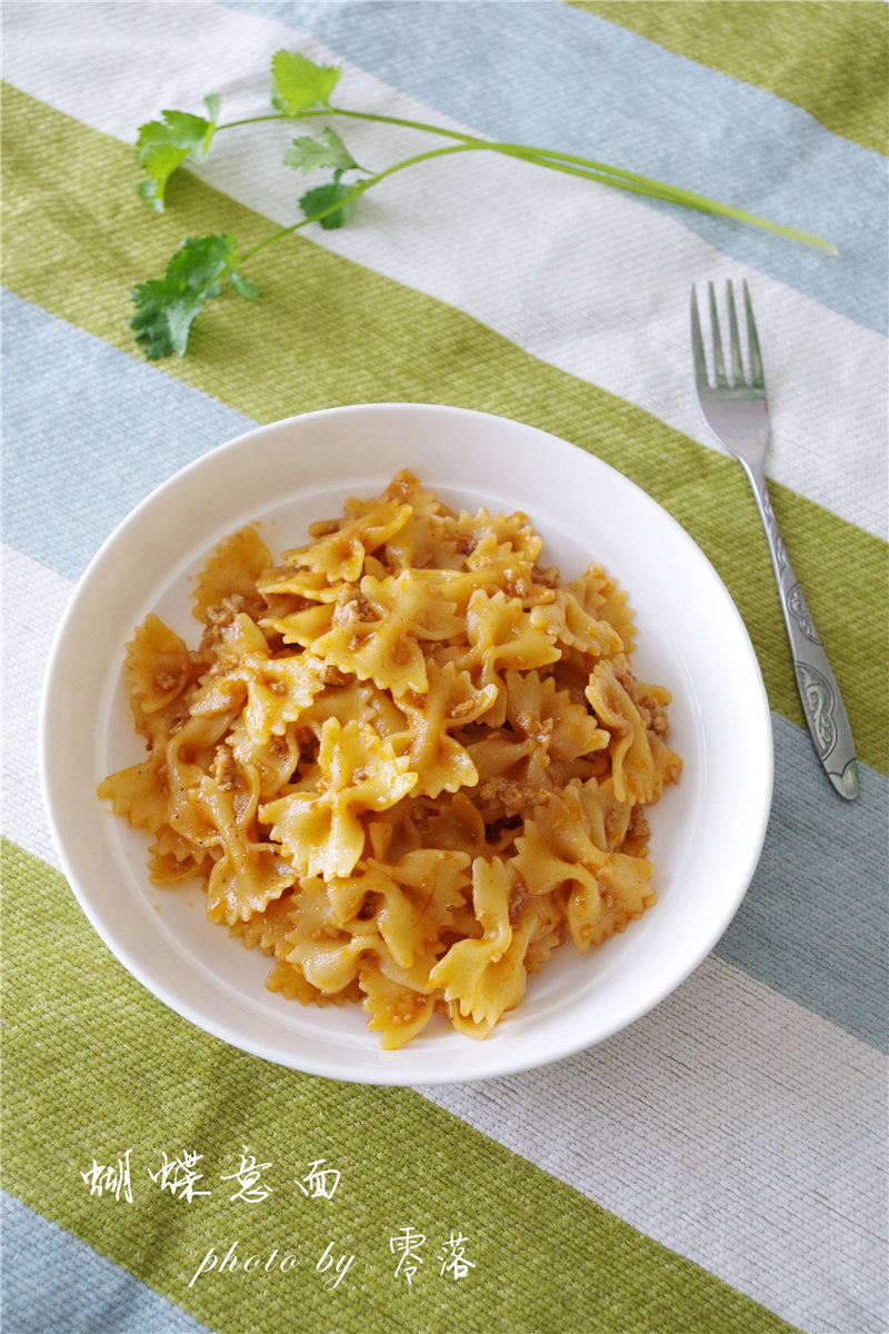 蝴蝶意面200g;猪肉末80g;