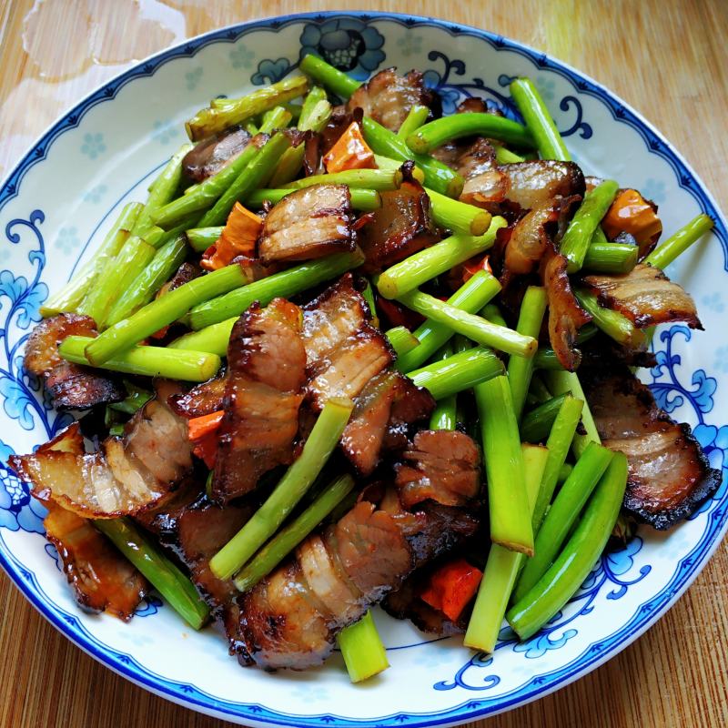 7:「拿了一小节炒了蒜苔炒酱肉,颜色看着还不错,温馨提示:因为是酱肉,所以炒之前需要用冷水泡泡,去下咸味,炒的时候也不用再加盐」。