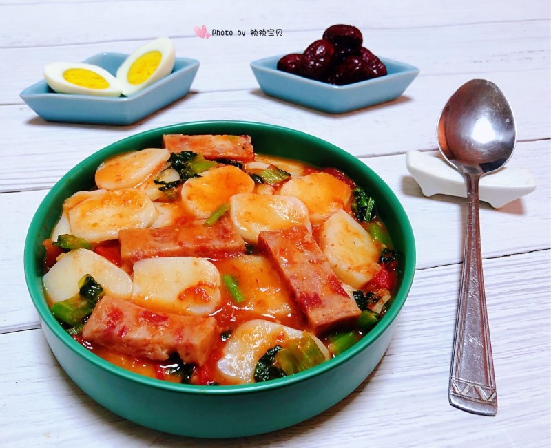 14:年糕和午餐肉一起入口香浓软嫩混搭番茄酸甜的口感让人回味无穷。