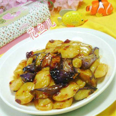 7:接着,锅内留适量的底油,下入炸好的茄子和焯好的年糕翻炒一下。