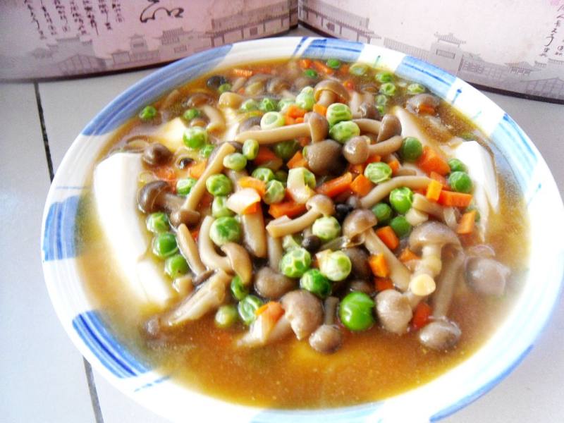 1:主辅料:内酯豆腐、蟹味菇、青豆、胡萝卜