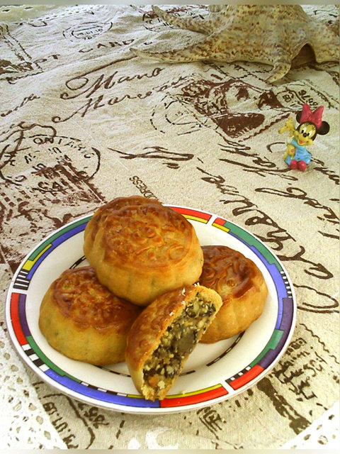 1:饼皮:低筋粉75克,转化糖浆60克,玉米油22克,碱水1克