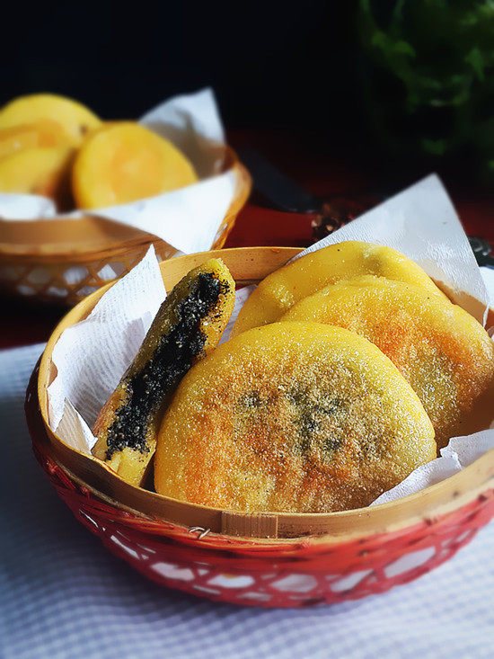 8:最后,取平底锅置火上倒油,下入做好的黑芝麻玉米粉糯米饼煎至两面金黄,即成。