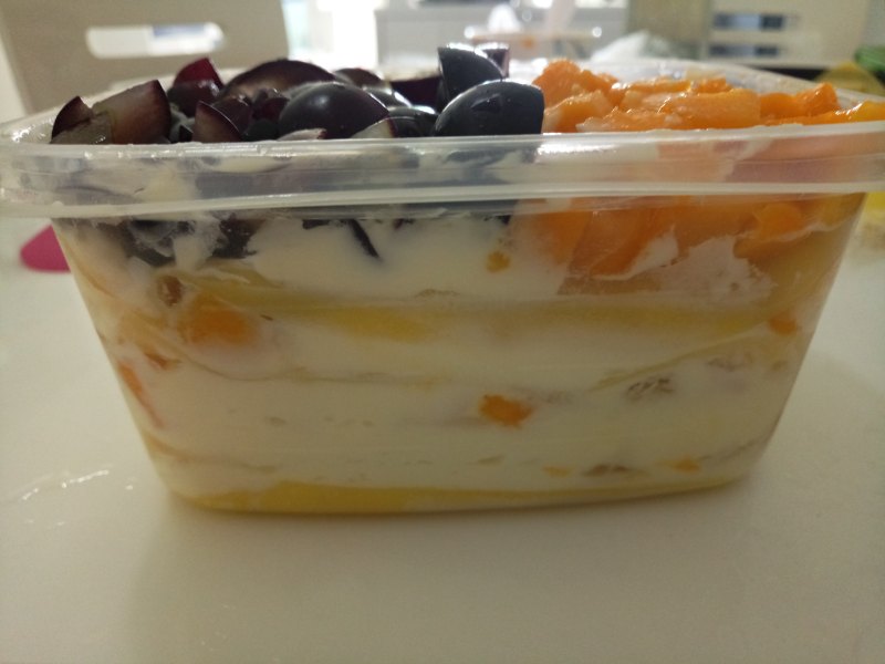 6:这样一层层组装好,一层,我这个是一层消耗一个草莓,叠三层消耗一个芒果。组装好以后盖保鲜膜冷冻2小时,冷藏2小时,随吃随取即可。