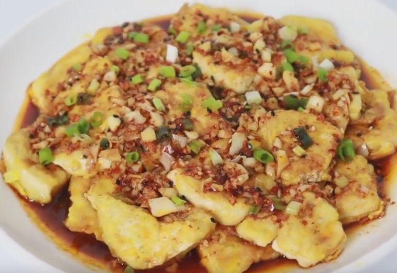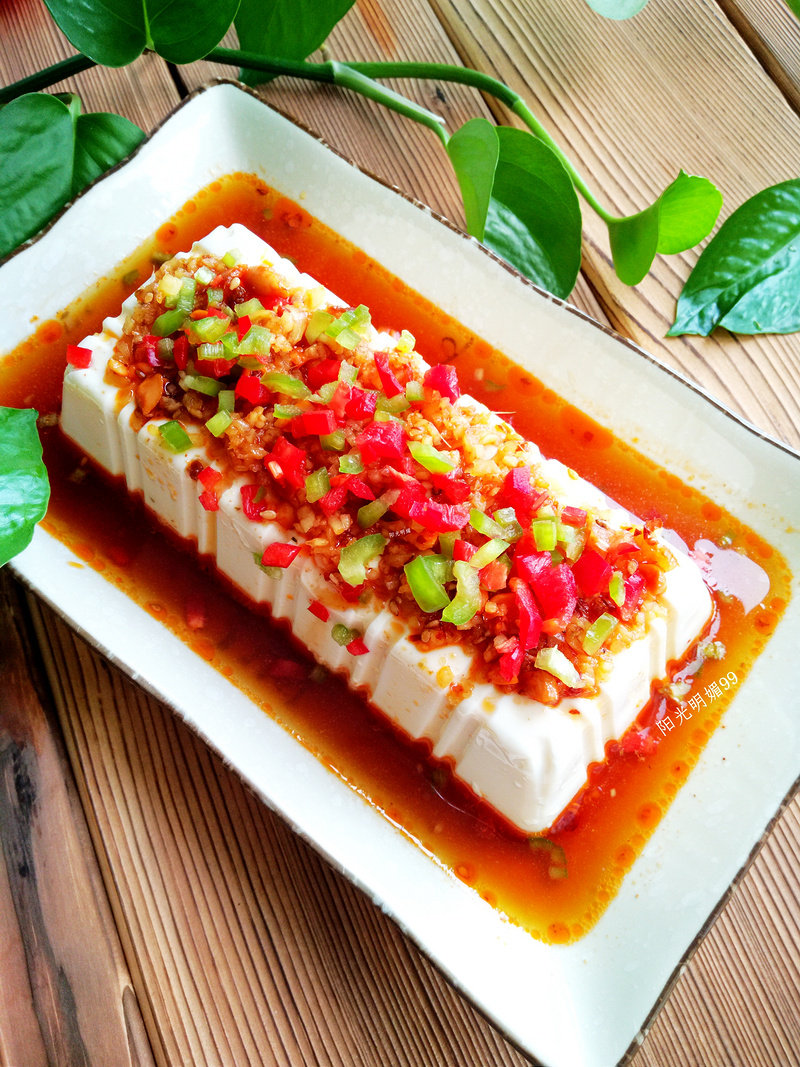 7:蒸好的豆腐撒上香菜,再用红辣椒点缀。