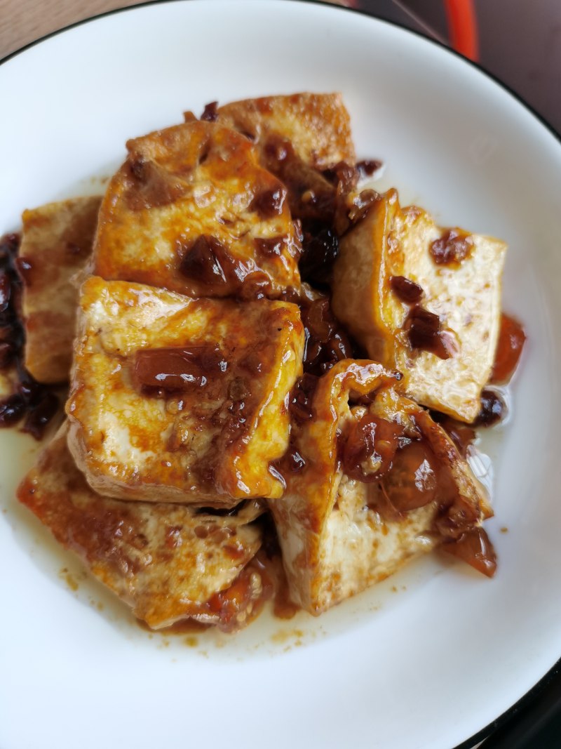 6:调好的汁放下去,继续烧一下,水分基本干就可以了。如果可以的话适当翻面,在豆腐不被弄破的前提下