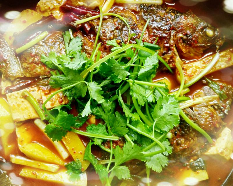 9:鲫鱼放锅中中火煎到两面金黄后,加清水煮开后放入香菜(清水要淹过鱼)