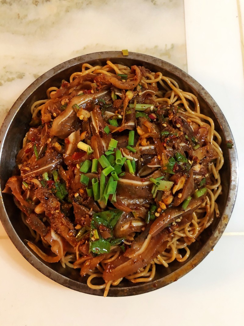 4:把凉面铺在盘子底部,猪耳叶和拌凉面一样,放入各种调料拌好,最后放在凉面上,撒上葱花即可。