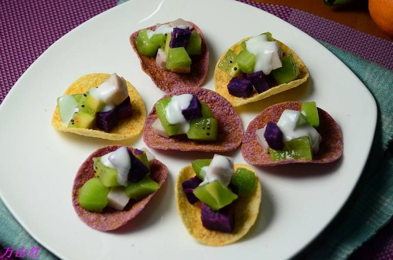 这款小点心是一定要随吃随做,不要就放,否则薯片就被水果汁浸泡的不够脆啦。