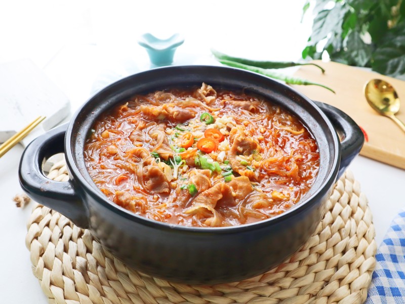 1.羊肉卷焯水后再和粉丝一起煲。2.配菜可随意更换,豆腐皮,金针菇,都是不错的选择。