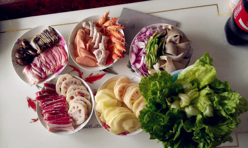 五花肉适量;腊肉适量;香肠适量;火腿肠适量;虾适量;虾饺适量;肉馅适量;青椒适量;平菇适量;藕适量;土豆适量;洋葱适量;生菜适量;