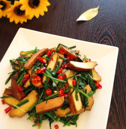 4:放入香干,炒至韭菜变软(大约一分钟),调入适量盐,关火装盘即可。