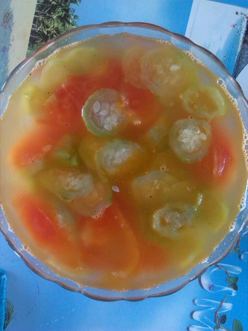 1:番茄丝瓜大蒜各切片