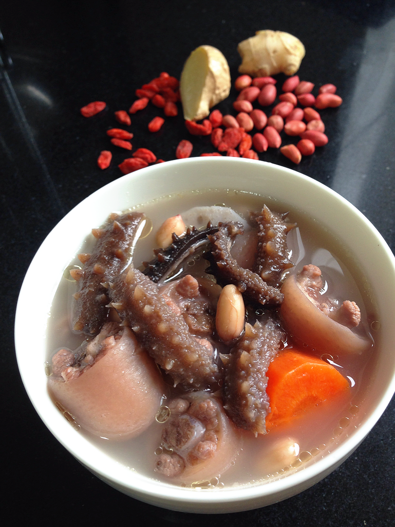 9:海参猪尾巴养生汤。海参补肾益精,调节血脂血糖,抗肿瘤,阴阳双补;猪尾巴补腰力益骨髓含丰富胶原蛋白;花生增强记忆降低胆固醇。