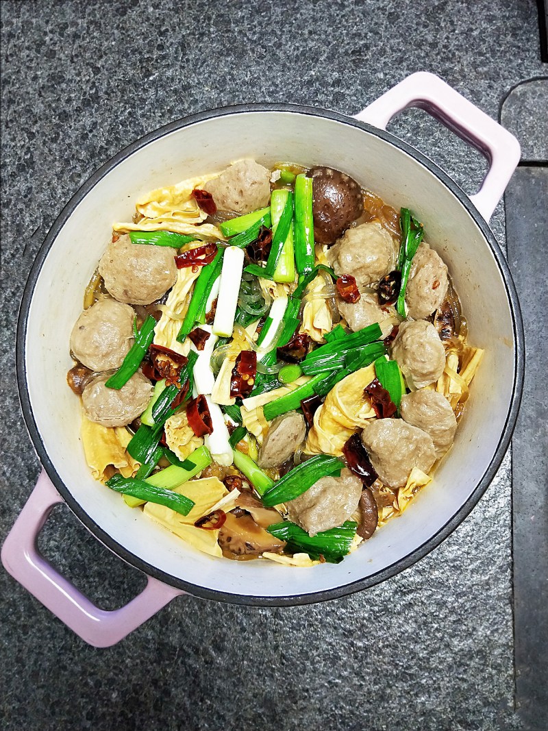 腐竹120g;红薯粉条80g;牛肉丸150g;蒜苗100g;