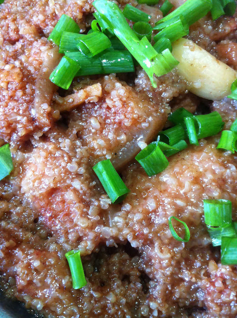 4:因为五花肉、排骨之类的是肉类,难免有肉腥味。个人制作时就喜欢加入一些蒜瓣、生姜丝放入米粉酱汁中。可加可不加,量多量少,根据个人喜好。