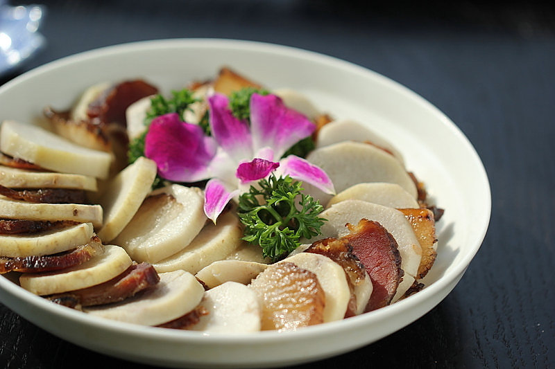 5:将腊肉与芋头分别一片片夹在一起围摆在盘里;