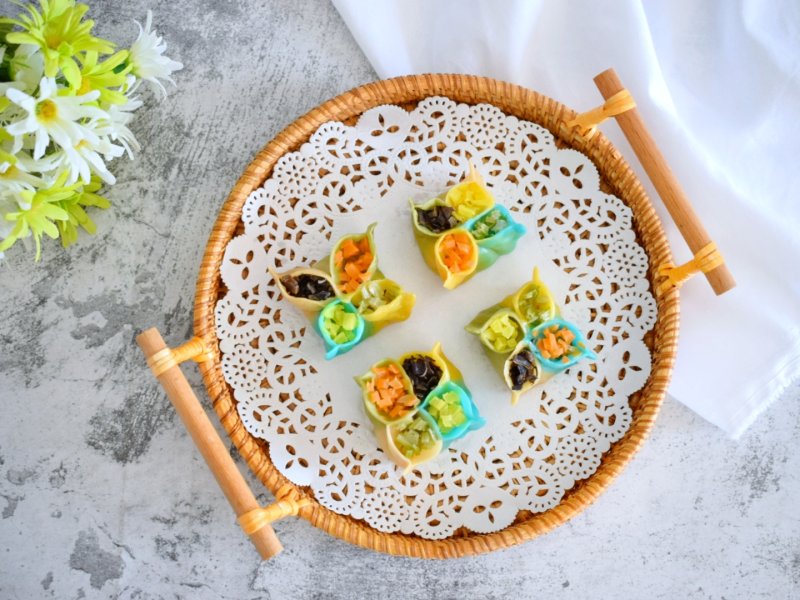 11:然后在每个花瓣里放入不同颜色的装饰蔬菜碎,然后在每瓣上捏一下。