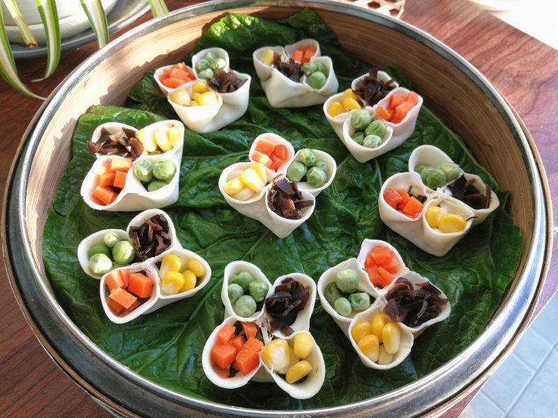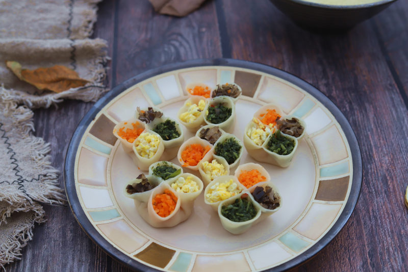 11:相邻的两个花瓣芯捏合在一起,使花瓣更大更饱满;在每个花瓣处分别填上四种蔬菜,每包好一个就放在蒸锅内;