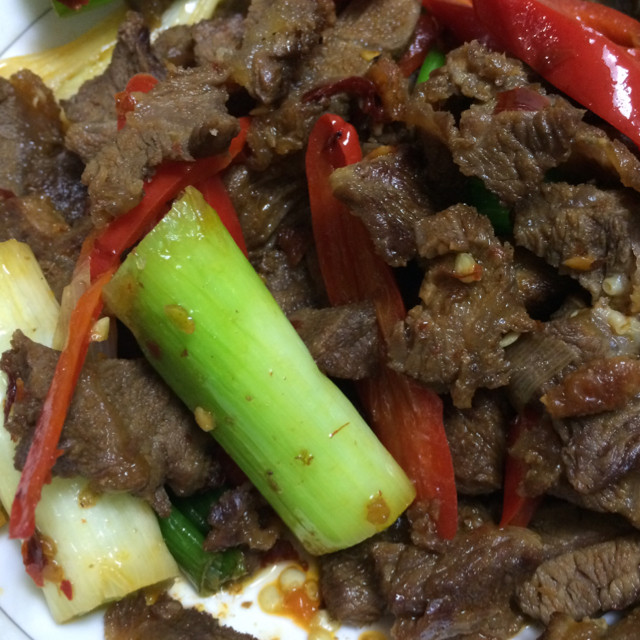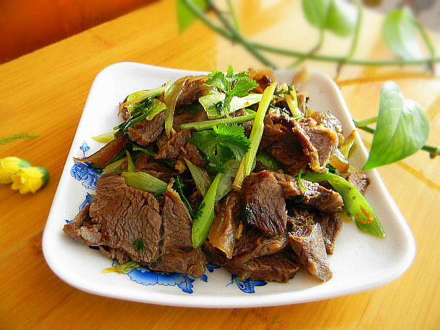 熟牛肉少油,吃油,所以,这道菜食用油要微微多加一些才香。葱要选择老一点的大葱,不要用香葱,不耐炒。