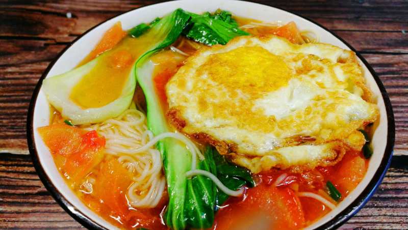 5:超好的番茄青菜叶浇在面上,煎蛋摆上面。加入少许香油,搞定。