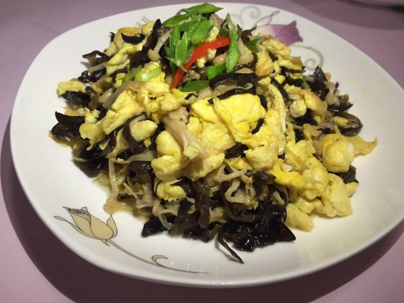 3:先炒鸡蛋盛出来,在放油先放姜辣椒炒一下,然把金针菇和黑木耳丝放锅里炒、放盐、感觉差不多时候把鸡蛋一起翻炒几下就OK了