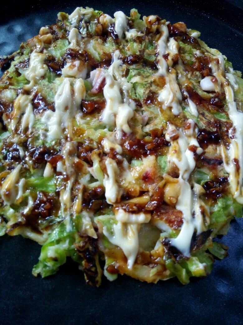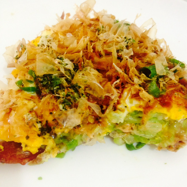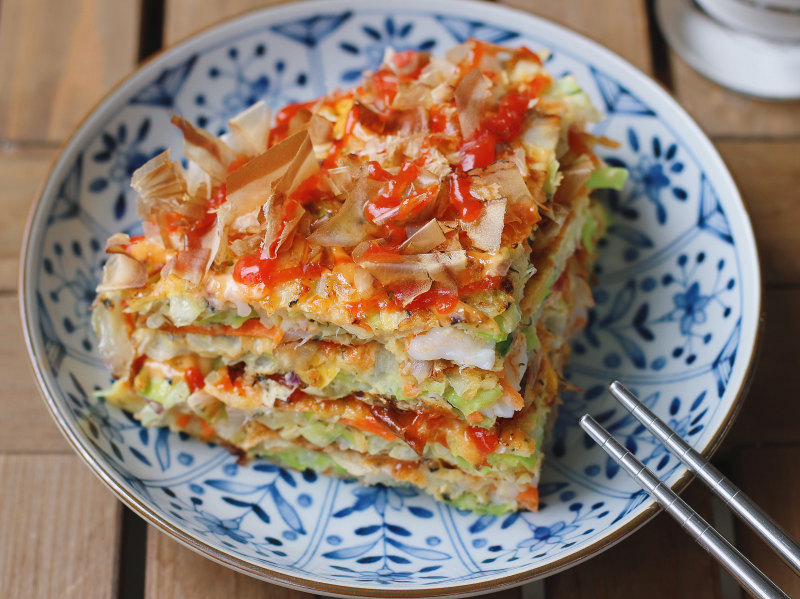 7:这个改良版本的大阪烧,火候控制得当的话,边缘还会有点焦脆,培根被煎得焦脆,隐约有焦糖的甜味;因为菜叶多,吃起来口感清甜;相比海苔粉,海苔丝能提供更丰富的层次感,而且随随便便摆盘都很漂亮
