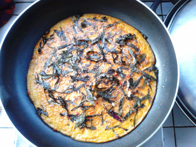 6:将平底锅刷一层薄油,倒入面糊,小火慢煎,晃动锅底以成型,翻开看金黄色,上面面糊基本不流动,就可以翻面了。我用的一个盘子放置饼身,平底锅倒扣翻面,由于手忙脚乱,第一面就没有拍照片。翻面之后,过半分钟左右,刷上调制的酱料,剪了一些烤紫菜点缀,出盘~