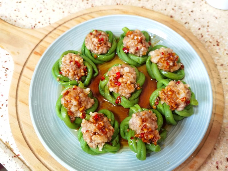 20:把酱汁淋在蒸好的豆角肉饼上。