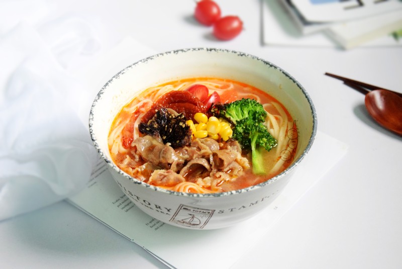 挂面90克;番茄1个;肥牛卷200克;玉米1段;西兰花3小朵;