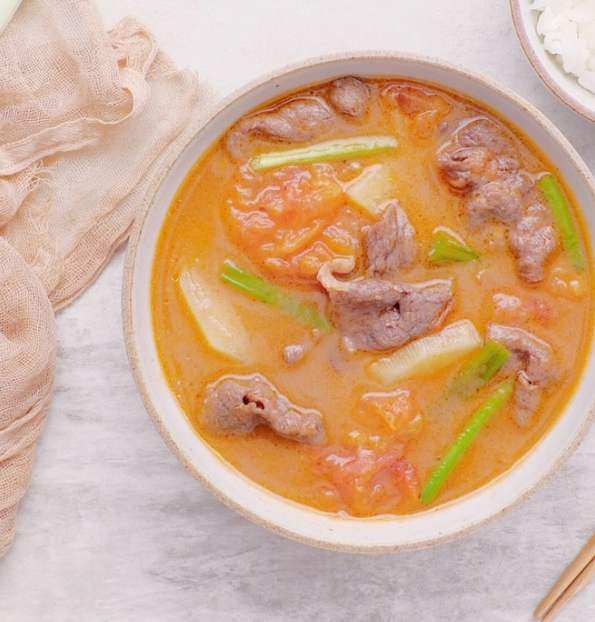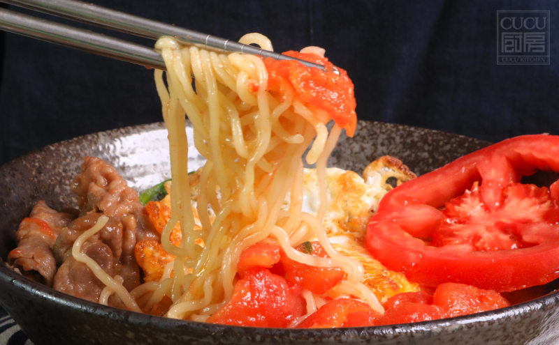 番茄可以用料理机打一打或切更碎,以缩短炒出汁的时间。肥牛卷不要烫太久,不然会硬。