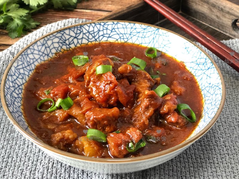 10:加入适量的番茄酱、料酒和生抽转小火炖1个小时左右。用筷子把锅盖架着防溢。