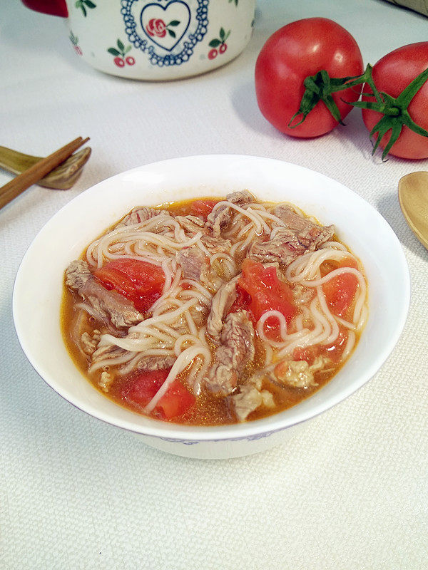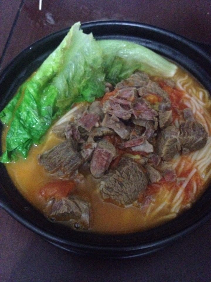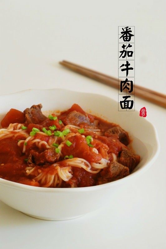 6:红色番茄的微酸,牛肉的酱香,河川延面的劲道爽滑,一碗美味的牛肉面就出锅啦。