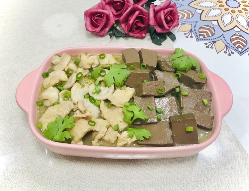 2:粉丝温水泡软,猪脆肠清洗干净切段,酸菜切小段,鸭血切块。