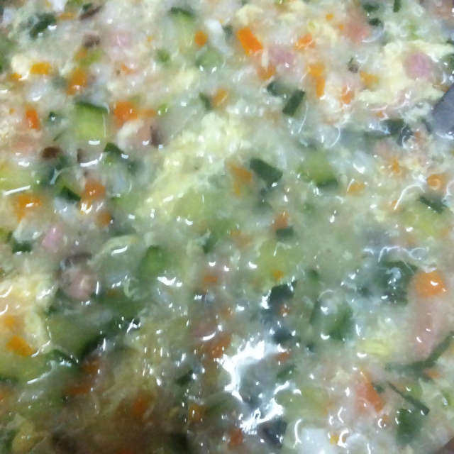 因为需要添加各类蔬菜,米和水的比例大概1:10。熬粥过程中,搅拌一下,以免粘锅底。