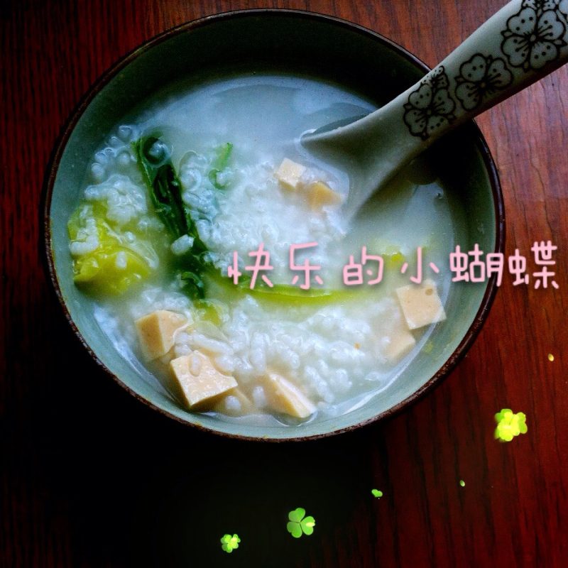 3:粥快熟了的时候加白菜或者你喜欢的菜菜放进去搅拌两分钟后放鸡肉肠就可以出锅了很清淡的配上咸菜好好吃噢